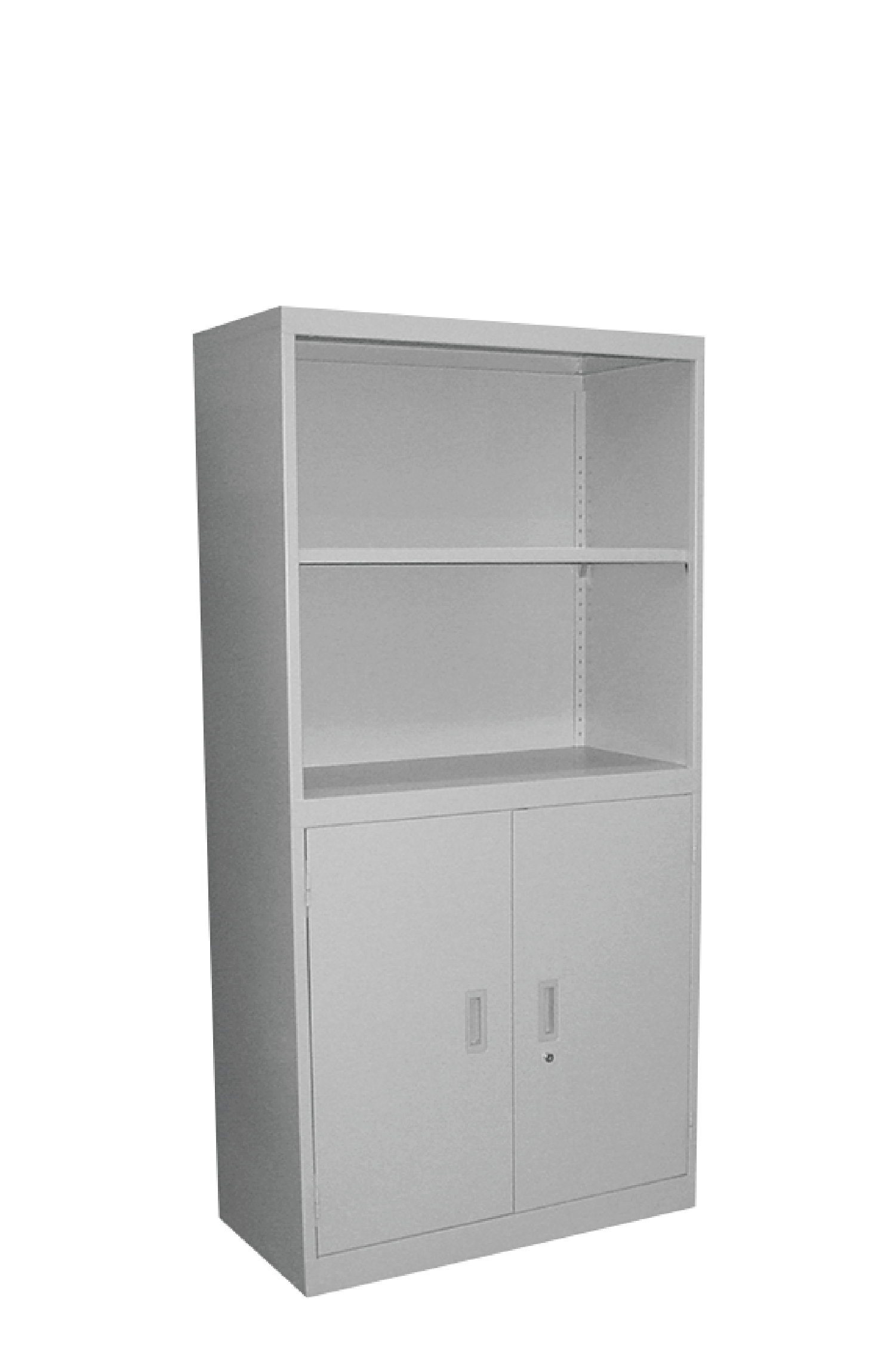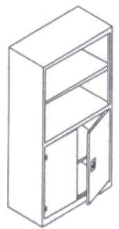 Steel cabinet with open shelves and swing doors